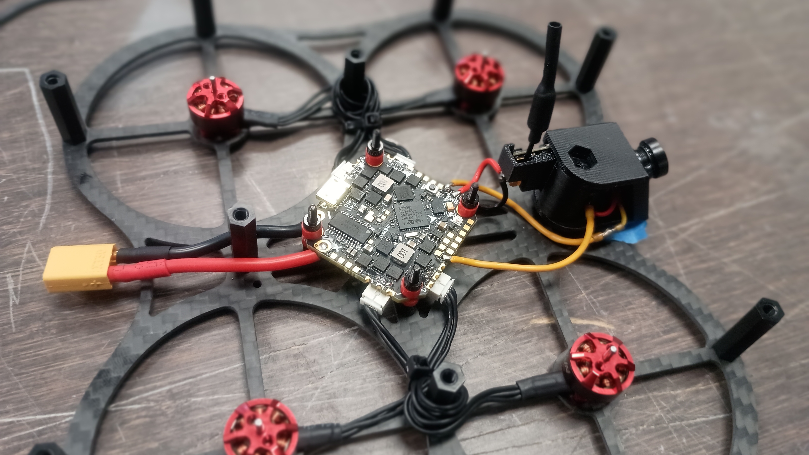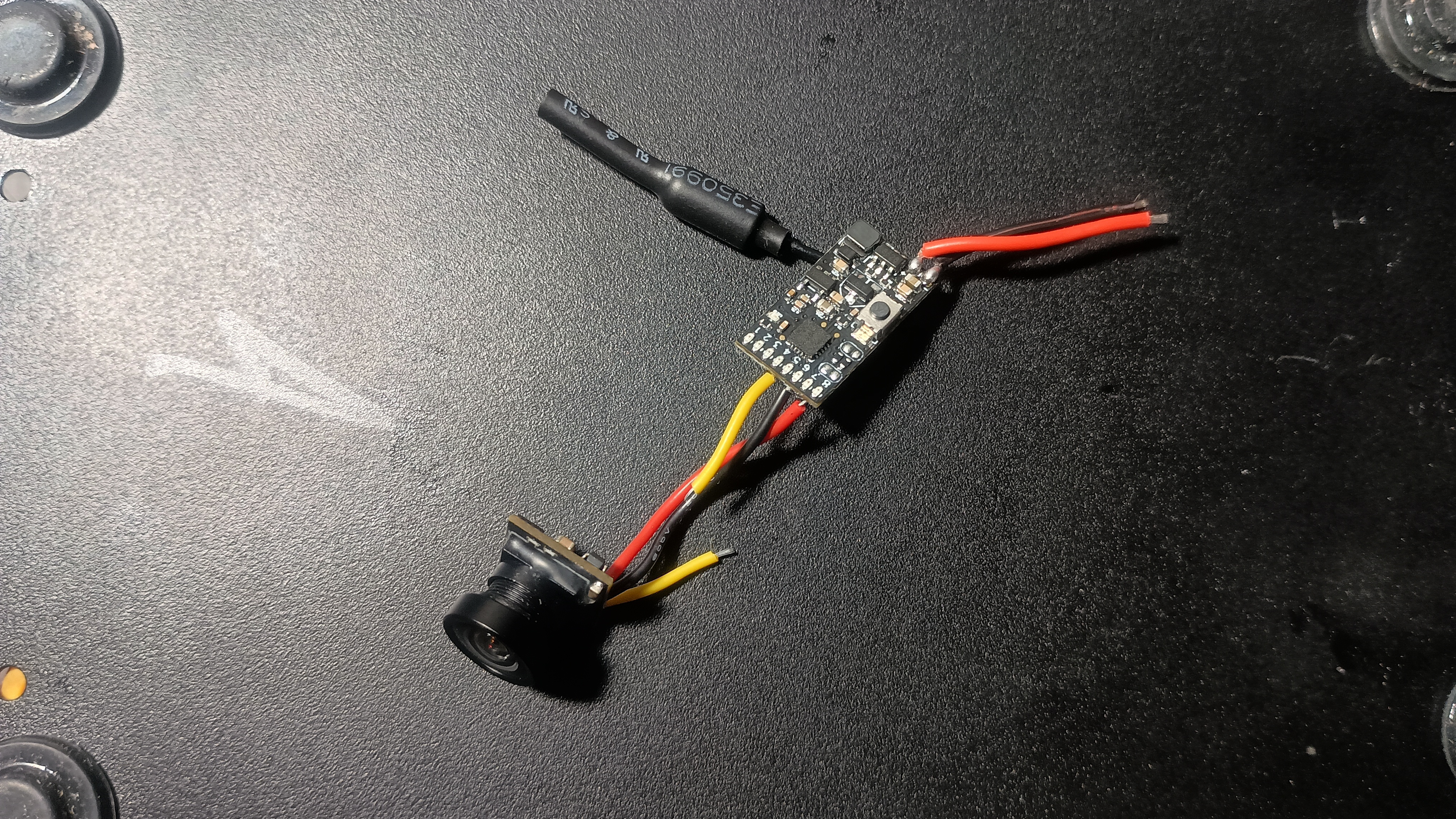 The first thing you'll need to do is to get to the yellow wire on the FT AIO FPV Camera and cut it roughly in the middle. That'll turn one wire connecting the camera to the VTX, into one video wire from the camera and another video wire into the VTX. Then you'll need to extend these wires by soldering on a couple of short lengths of wire and covering it with some heat shrink tubing.