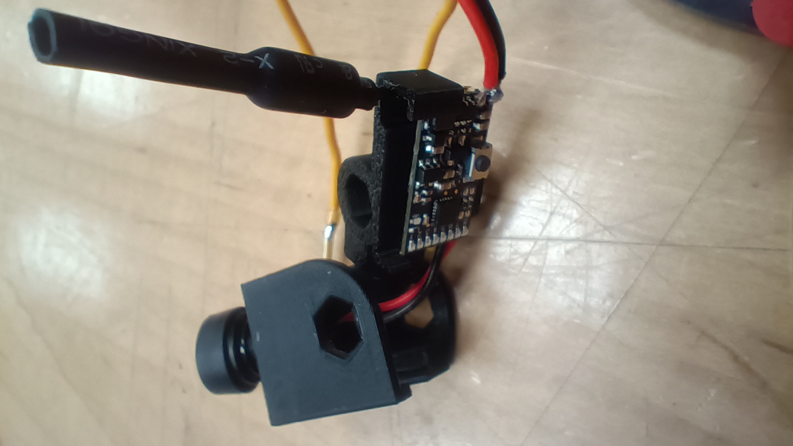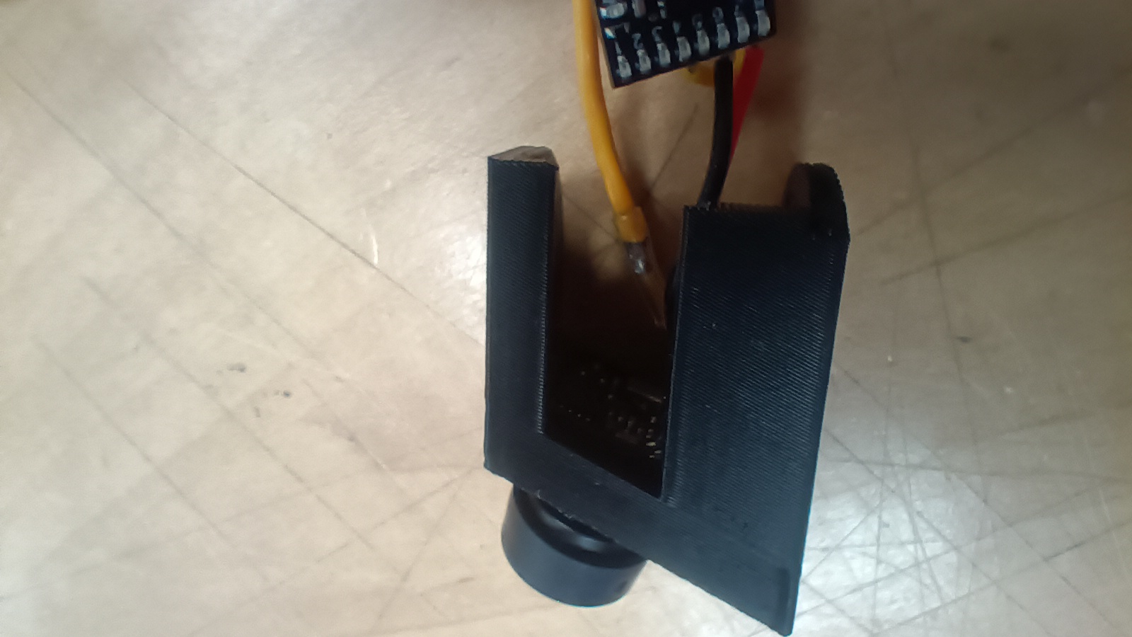 Now that's it. You're done. I suppose I could take a moment to try to explain how the camera mount works though. First, stick the camera into the hole with the wires on the bottom of the board.